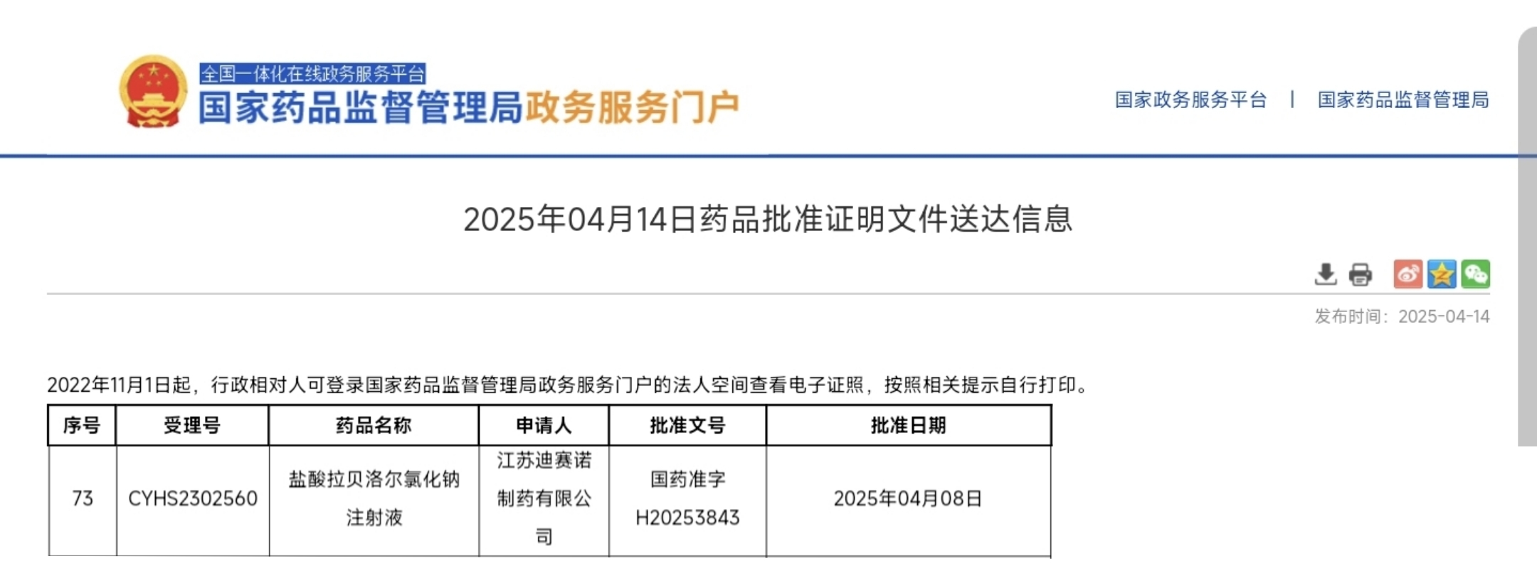 2025年4月8日,开云网的盐酸拉贝洛尔氯化钠注射液(国药准字H20253843)成功获得国家药品监督管理局(NMPA)批准上市,该产品是公司的化药3类仿制药,是该品种药物的国内首仿。这一成果标志着公司在心血管领域的产品布局迈上新台阶,也为广大患者提供了更优质的用药选择。